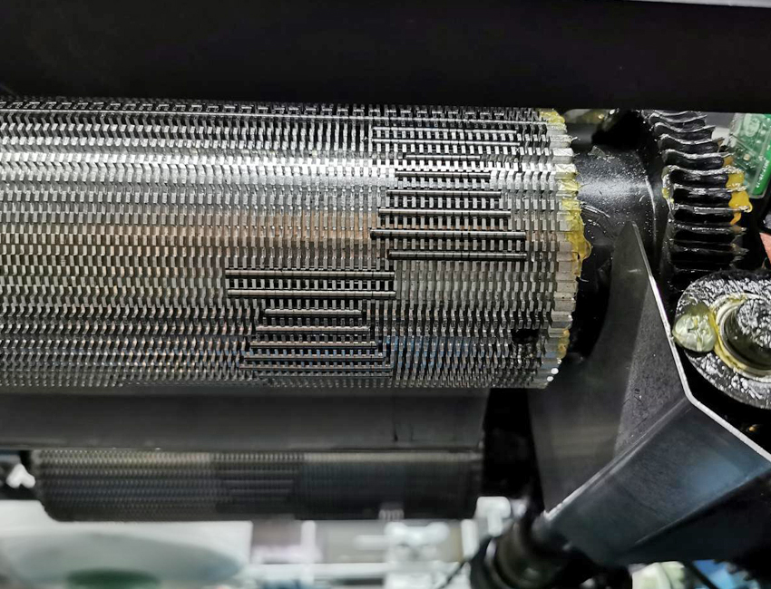 滾筒采用蝸輪蝸桿選針系統(tǒng),正反轉(zhuǎn)的新功能為手套編織時(shí)的選針提供了更多可能性,使織物的花型更加豐富。滾筒可以在任意位置實(shí)現(xiàn)超快速復(fù)位(速度是500 RPM),無需換高低針腳,可以實(shí)現(xiàn)橡筋一隔一,一隔二等自由切換。